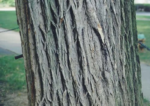 Bark: Dark gray, becoming deeply furrowed and divided into broad, flat ridges with age. Young bark smooth and grayish-brown.