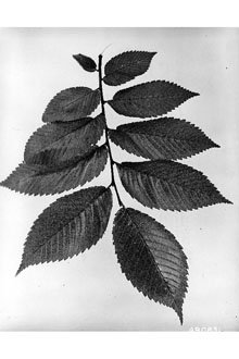 Leaves: Simple, alternate, doubly serrate, ovate to oblong, 7–12 cm long. Asymmetrical base, acuminate tip; dark green and rough above, paler and smooth beneath; turn yellow in fall.