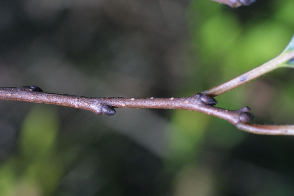 Buds: Small, conical, dark brown with overlapping scales.