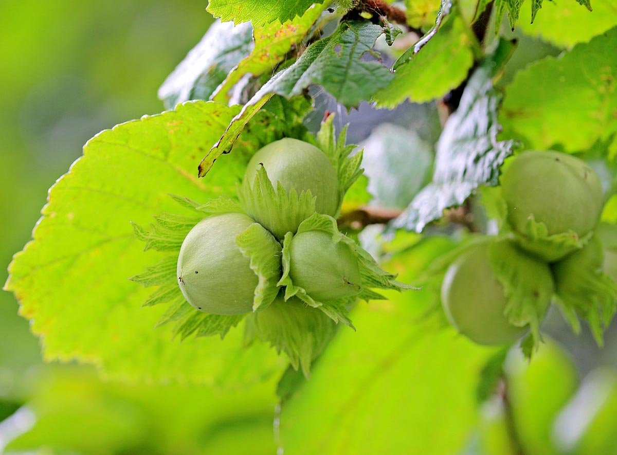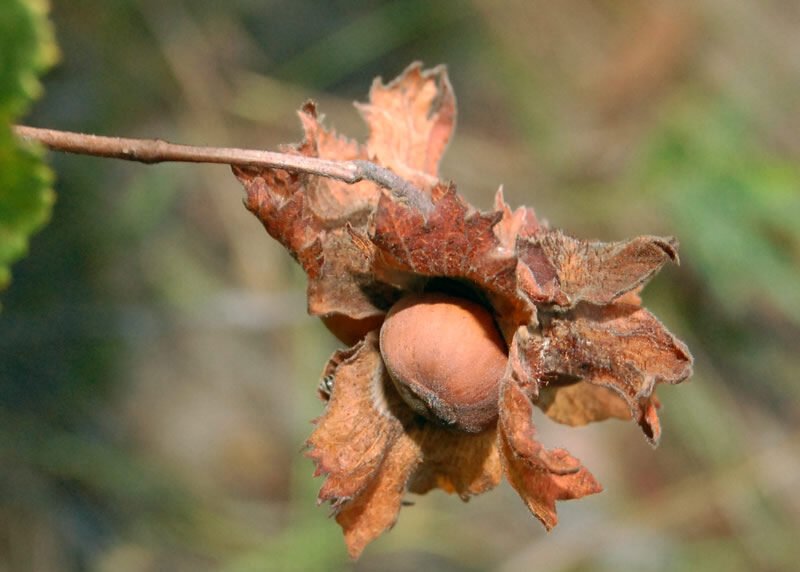 Fruit: A round to ovoid nut (1.5–2 cm diameter) enclosed in a leafy, fringed husk about twice the nut’s length; borne in clusters of 2–6.